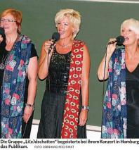 "Lieder aus vielen Zeiten und Ländern" Mit ihrem gesanglichen Können überzeugten die sieben Chorsängerinnen der Gruppe „Li(e)dschatten“ ihr überwiegend weibliches Publikum in Homburg. Sie sangen Lieder aus vielen Zeiten und Ländern. |